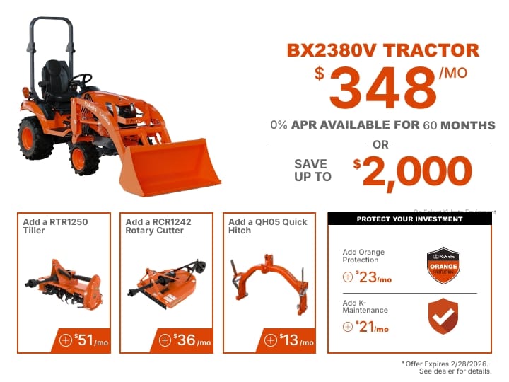 $0 Down, 0% A.P.R. financing for up to 60 months on purchases of new Kubota BX2380 equipment dealers’ in-stock inventory is available to qualified purchasers through Kubota Credit Corporation, U.S.A.; subject to credit approval. Example: 60 monthly payments of $16.67 per $1,000 financed. Customer instant rebate of $2,000 on Kubota BX2380 available with cash or standard rate financing, including $0 Down, 4.99% A.P.R. financing for up to 84 months. Customer Instant Rebate is not available with 0% A.P.R. or other promotional financing. Offers expire 02/28/26. Terms subject to change. For complete warranty, disclaimer, safety, incentive offer and product information, consult your Dealer or KubotaUSA.com.
