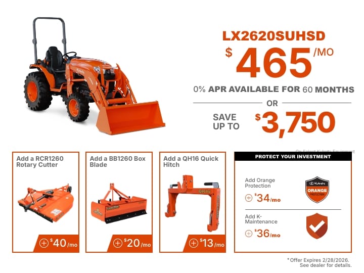 $0 Down, 0% A.P.R. financing for up to 60 months on purchases of new Kubota BX2380 equipment dealers’ in-stock inventory is available to qualified purchasers through Kubota Credit Corporation, U.S.A.; subject to credit approval. Example: 60 monthly payments of $16.67 per $1,000 financed. Customer instant rebate of $2,000 on Kubota BX2380 available with cash or standard rate financing, including $0 Down, 4.99% A.P.R. financing for up to 84 months. Customer Instant Rebate is not available with 0% A.P.R. or other promotional financing. Offers expire 02/28/26. Terms subject to change. For complete warranty, disclaimer, safety, incentive offer and product information, consult your Dealer or KubotaUSA.com.